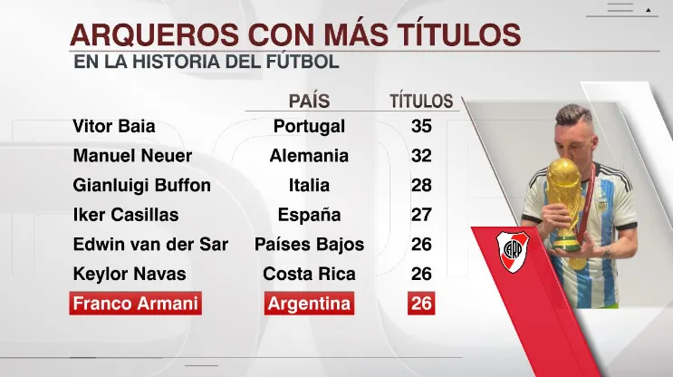 Aunque los 26 trofeos no solo lo integran Franco Armani y Keylor Navas, también se encuentra el histórico Edwin Van Der Saar de Países Bajos, que dejó grandes actuaciones con su país, Ajax, Juventus, Manchester United, entre otros.