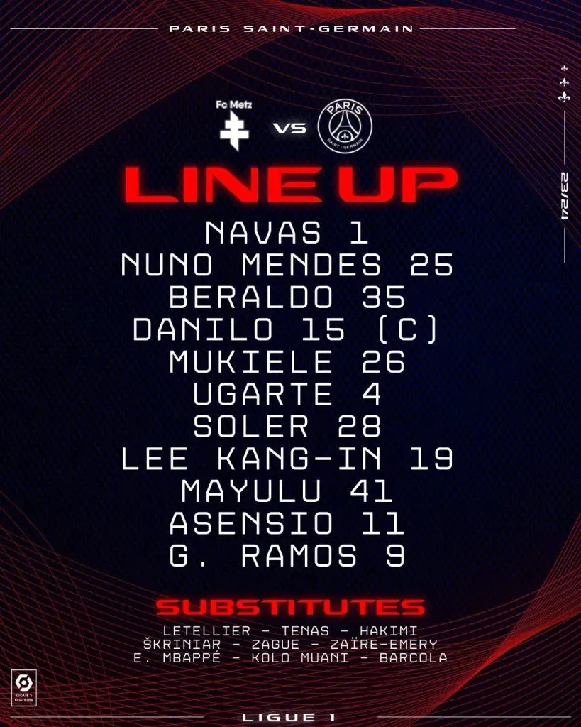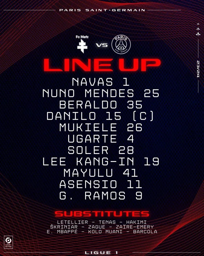A diferencia de lo que ocurrió en el juego pasado contra el Niza, para éste ante el Metz el entrenador Luis Enrique incluyó a Keylor Navas entre los convocados. El otro portero de la lista es Arnau Tenas, quien fue titular en la jornada anterior, mientras que Gianluigi Donnarumma tendrá descanso pensando en el encuentro decisivo por la Copa de Francia.