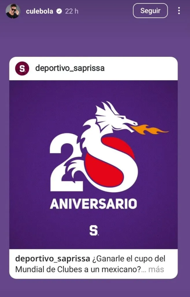 En primer lugar, Christian Bolaños reposteó una imagen haciendo referencia a lo que fue la participación del Saprissa en el Mundial de Clubes en su momento, recordando la reciente decisión del TAS que determinó que Alajuelense no participaría en esta edición del Mundial en 2025.