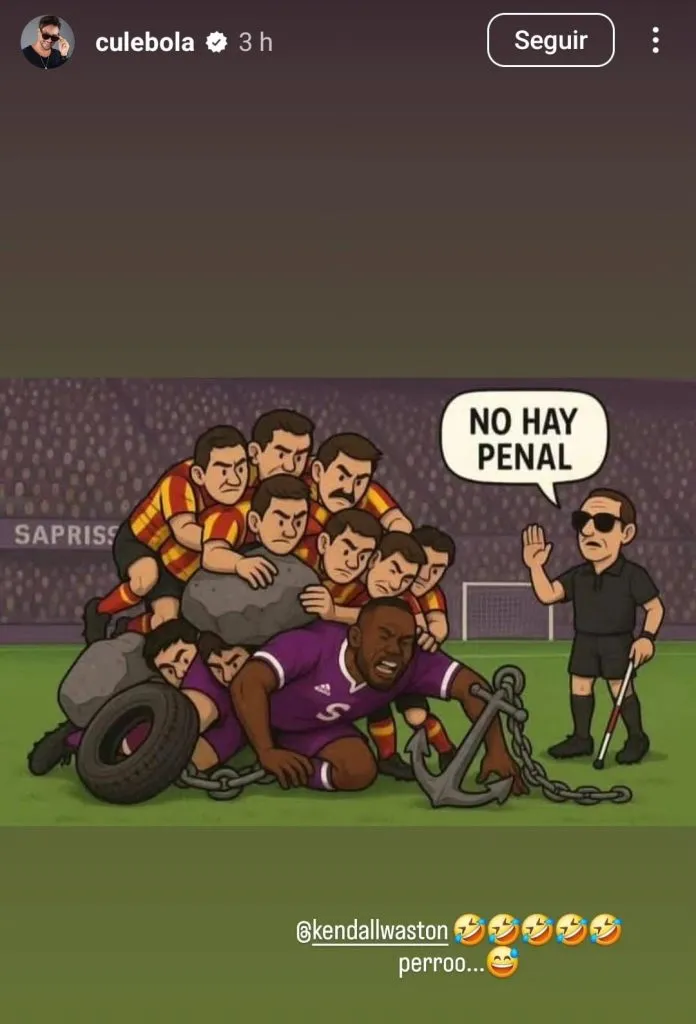 Pero no se quedó ahí, aprovechando la goleada del Saprissa a Herediano, publicó una imagen burlándose del arbitraje que tomó la decisión de no pitar un penal claro sobre Kendall Waston. Acción que se prestó para las burlas en las redes sociales.