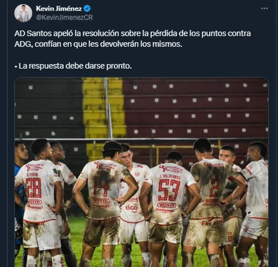 La Asociación Deportiva Santos ha decidido apelar la resolución en la que se le sancionó con la pérdida de puntos en su reciente enfrentamiento contra la Asociación Deportiva Guanacasteca (ADG), según explicó el periodista Kevin Jiménez en sus redes sociales. En donde también detalló que la respuesta oficial sobre esta situación se deberá dar pronto.
