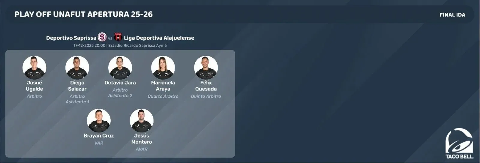 Además de Ugalde como principal, Diego Salazar será el primer asistente, Octavio Jara el número 2. Marianela Araya estará como cuarta árbitra y Féliz Quesada como quinto. En el VAR, decidirá Brayan Cruz, mientras que Jesús Montero irá como AVAR.