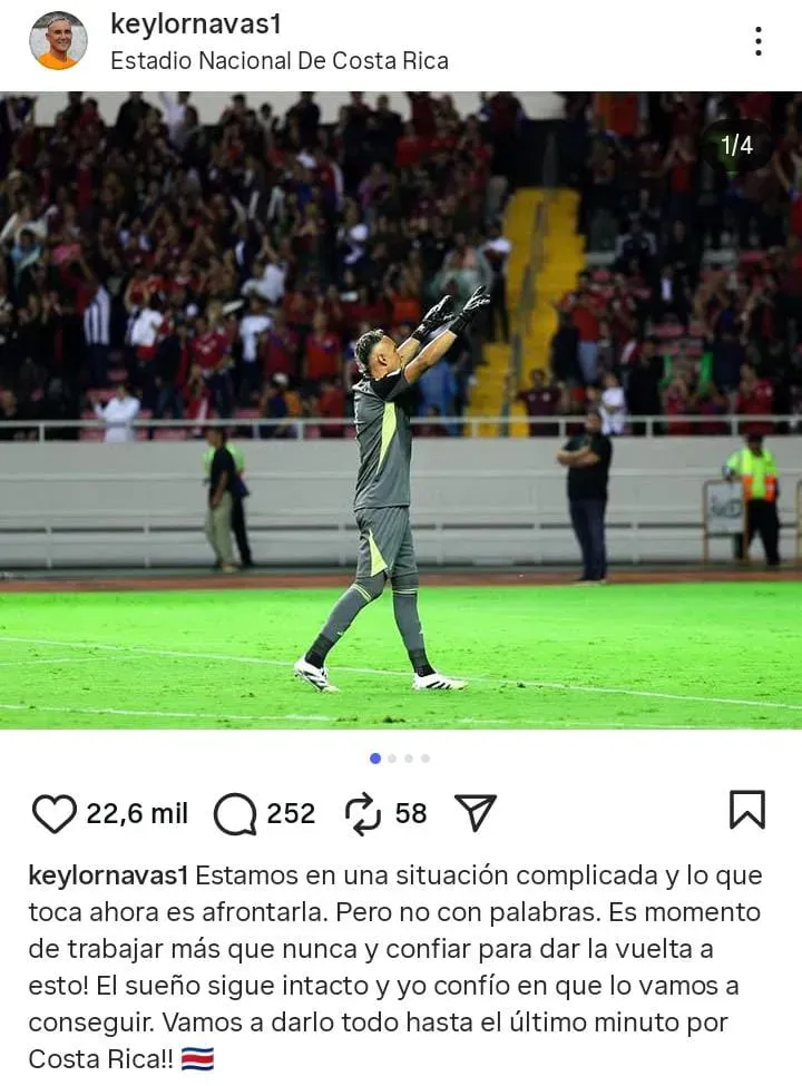 A través de un posteo en su cuenta de Instagram, Keylor Navas se comprometió con el pueblo costarricense a obtener la clasificación al Mundial pese al difícil panorama de La Sele: “Estamos en una situación complicada y lo que toca ahora es afrontarla, pero no con palabras. Es momento de trabajar más que nunca y confiar para dar la vuelta a esto”, aseguró.
