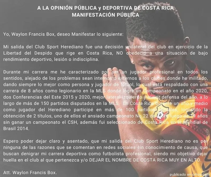“Mi salida del Club Sport Herediano fue una decisión unilateral del club en ejercicio de la Libertad del Despido que rige en Costa Rica, NO obedeció a una situación de bajo rendimiento deportivo, lesión o indisciplina“, comenzó aclarando Waylon Francis en el texto que publicó.