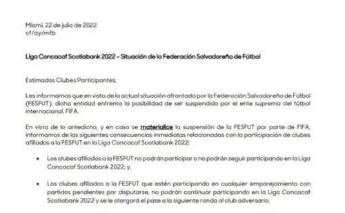 Ahora fue Concacaf la que se manifestó, al enviar una carta dirigida a Alianza, Águila y Platense porque tienen el riesgo de quedar fuera de la Liga Concacaf que iniciará la próxima semana, siempre y cuando se confirme la sanción de FIFA que estaría dando a conocer su decisión el lunes a primera hora.