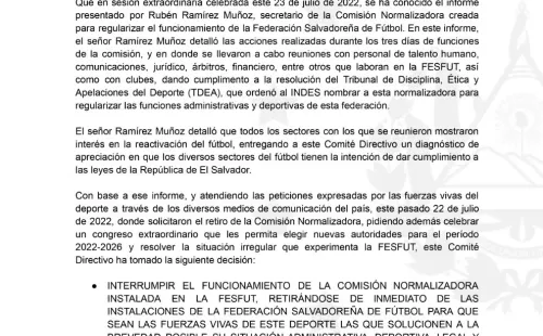 Entre las peticiones que dio a conocer el INDES estaba el retiro de la Comisión Normalizadora, algo que ya se hizo, pero también la creación de un congreso extraordinario que le permita a las fuerzas vivas del futbol elegir a los integrantes del Comité Ejecutivo de la Fesfut el cual estará del 2022 al 2026 y homologar los estatutos de la Federacióna la Ley del Deporte.