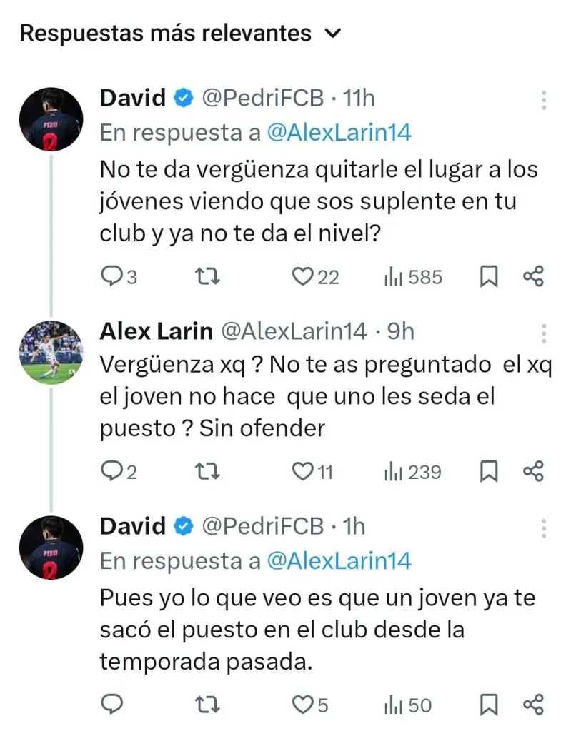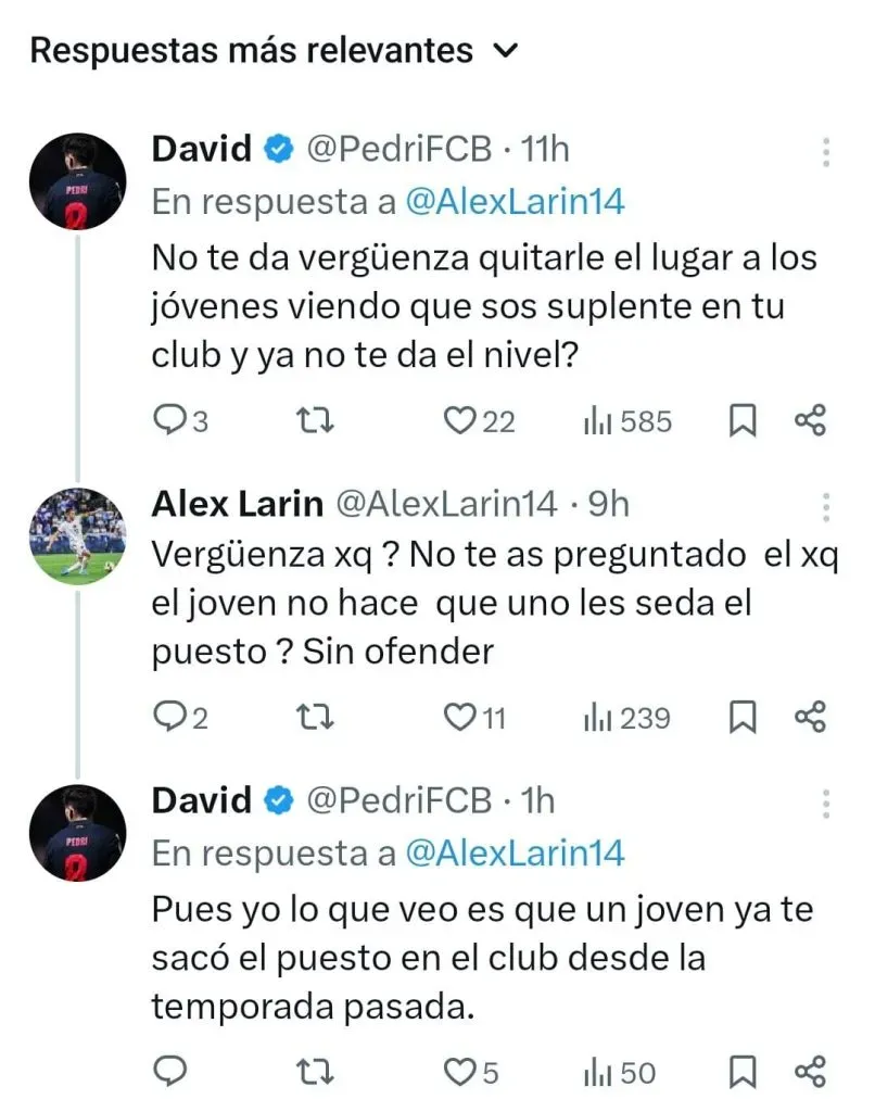 Bajo la publicación, una cuenta anónima con una imagen del futbolista español Pedri decidió faltarle el respeto. Lo trató de sinvergüenza y hasta le remarcó que es suplente en su club. También le “recomendó” dejarle su puesto a un joven. Fue la contestación de Larin la que desató el escándalo interno, en la que dijo que ningún joven lo puede obligar a ceder su lugar en la cancha.