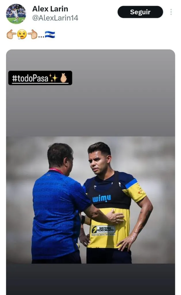 Alex Larin posteó una imagen suya junto al entrenador Hernán Gómez, con un rostro infeliz, pero con cierta expresión de desahogo. “Todo pasa. Recargando“, publicó el futbolista a través de su cuenta oficial de X. El portador del dorsal 13 pasó por situaciones deportivas totalmente desafortunadas, pero está en pie.