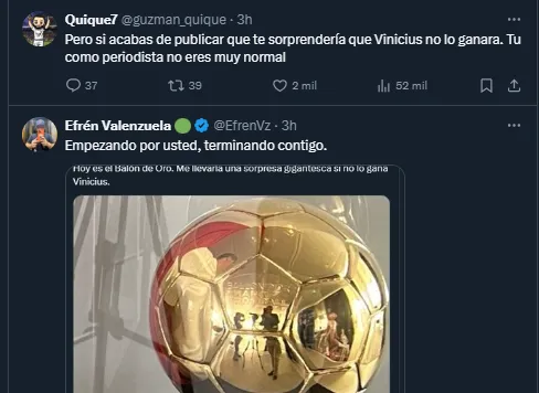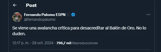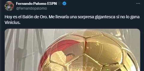 A través de sus redes sociales Fernando Palomo empezó publicando varios mensajes en su cuenta oficial X sobre el Balón de Oro 2024, Vinicius y el Real Madrid. Algo que trajo una montaña de mensajes de aficionados merengues “ofendidos” por el periodista de El Salvador.