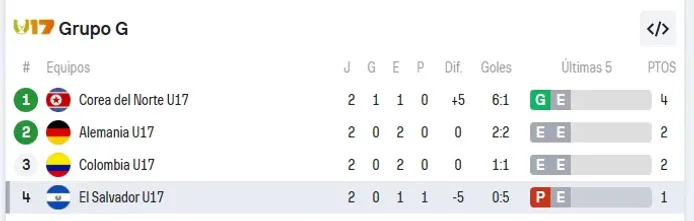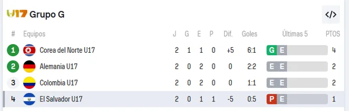 Así marchan El Salvador y Alemania en el Grupo G del Mundial Sub-17: la selección alemana suma 2 puntos tras empatar sus dos partidos, mientras que El Salvador aparece en el fondo con 1 unidad y una diferencia de gol complicada (-5).