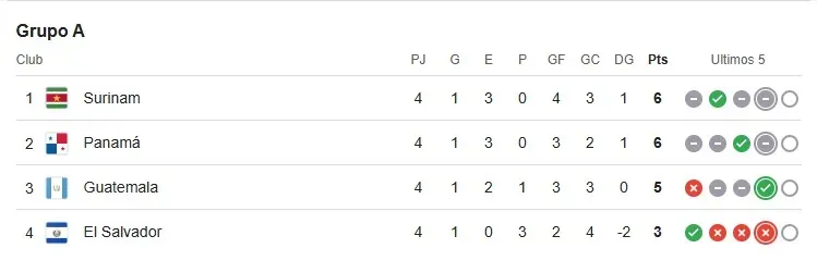 Para el final de la etapa cuatro, Surinam continúa como líder del Grupo A tras empatar en 1-1 con Panamá, escolta de esta zona.
