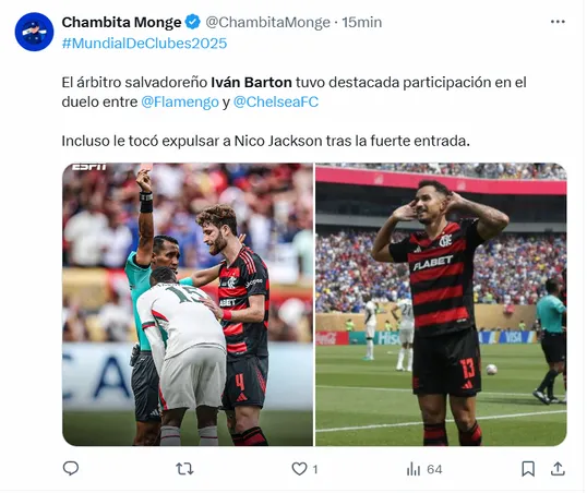 El salvadoreño Iván Barton fue el protagonista inesperado del emocionante partido entre Flamengo y Chelsea por el Mundial de Clubes de la FIFA, ente que confió en las capacidades del centroamericano para un partido que desde la previa se esperaba mucho y el colegiado no decepcionó con sus decisiones en el campo.