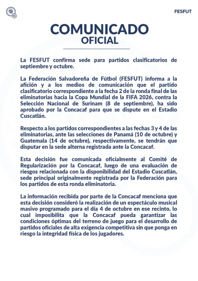 Ante este comunicado, la FESFUT mencionó que la Concacaf le recordó que en 2022 ocurrió un antecedente que llevó a que se tome esta decisión. En aquel momento, se jugó un partido días después de un concierto y el campo de juego se encontraba en malas condiciones. Por este hecho, no quieren que vuelva a pasar lo mismo.