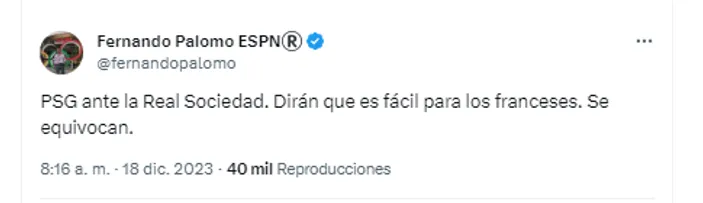 “PSG ante la Real Sociedad. Dirán que es fácil para los franceses. Se equivocan.”, comentó Fernando Palomo, dejando claro que el conjunto español no será una tarea sencilla para los parisinos, aunque los franceses parten como favoritos en esta serie.