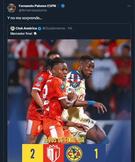 A través de su cuenta oficial en la plataforma de X, el periodista salvadoreño Fernando Palomo expuso un picante mensaje tras oficializarse la derrota del América ante el Real Estelí en la Concachampions 2024.