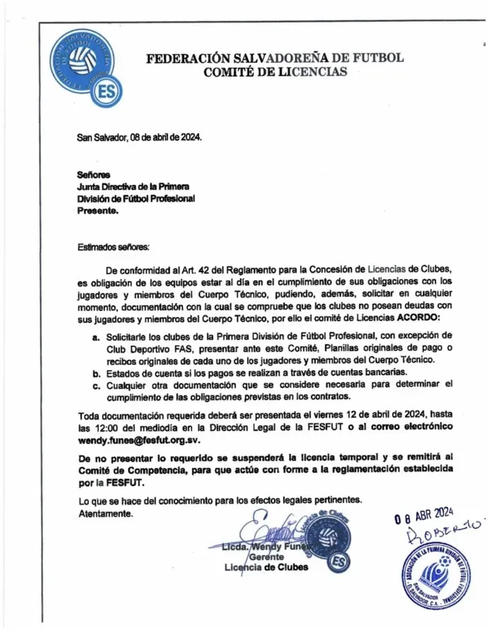 El Comité de Licencias de la Federación Salvadoreña de Fútbol (FESFUT) ha emitido una circular a los equipos de la Primera División Profesional, solicitándoles la presentación de las planillas de pago de jugadores y cuerpo técnico a más tardar el viernes 12 de abril al mediodía.