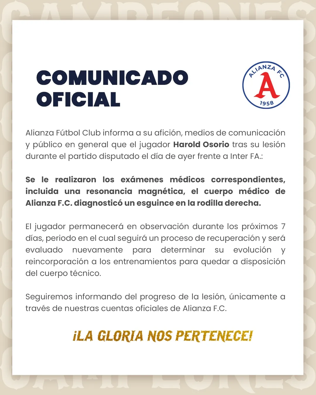 Con estas declaraciones, Harold Osorio deja en claro que su prioridad es continuar su carrera fuera de El Salvador. Actualmente, se recupera de un esguince en su rodilla derecha que sufrió en el partido contra Inter FA.