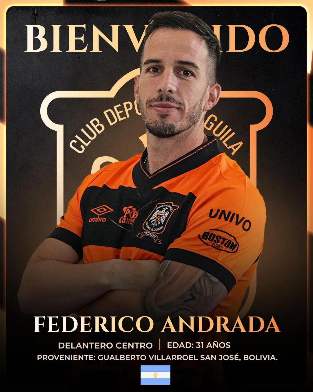 El Club Deportivo Águila hizo oficial este fin de semana el fichaje del delantero argentino Federico Andrada, una incorporación con la que el conjunto migueleño busca fortalecer su zona ofensiva y cerrar definitivamente su plantel de cara al Torneo Clausura 2026.