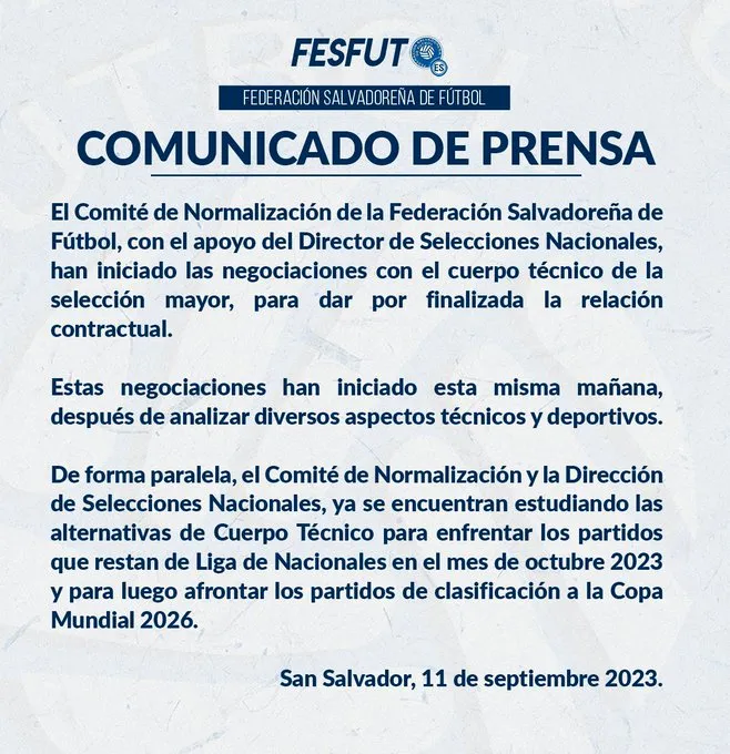 Durante la tarde de este lunes, la FESFUT dio a conocer que, Pérez no continuará siendo entrenador de la Selección de El Salvador. Por lo que, a partir de estos momentos, estarían buscando un nuevo timonel, de cara a los próximos retos.