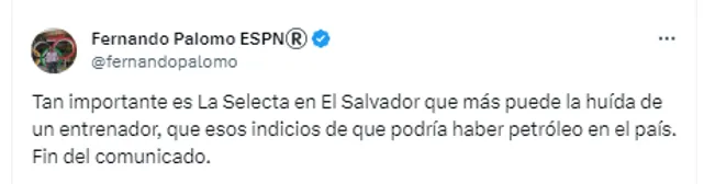 A través de sus redes sociales, el periodista salvadoreño, Fernando Palomo expuso lo siguiente: “Tan importante es La Selecta en El Salvador que más puede la huida de un entrenador, que esos indicios de que podría haber petróleo en el país. Fin del comunicado”, expuso el comunicador centroamericano.
