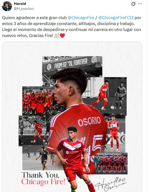 “Quiero agradecer a este gran club por estos 3 años de aprendizaje constante, altibajos, disciplina y trabajo. Llegó el momento de despedirse y continuar mi carrera en otro lugar con nuevos retos. ¡Gracias, Fire!”, expresó Harold Osorio en su cuenta de X.