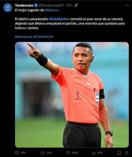 A pesar de que hubo algunos usuarios que estuvieron a favor de las decisiones de Barton, la mayor parte de los navegantes, se mostraron indignados. “Destruyó el sueño de millones de hondureños, es lo que hizo. Es el mejor árbitro de la Concacaf. Y en esta casa, Iván Barton es un héroe nacional. Fin de la historia”, escribió uno.