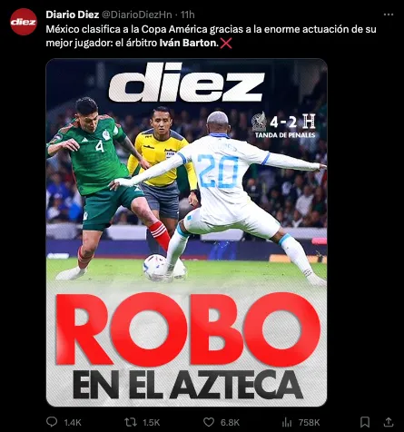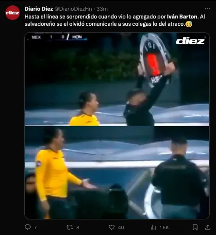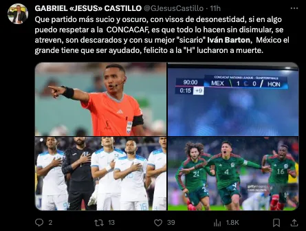 “Ivan Barton no activó el protocolo por el grito que se ha dado 11 veces. En cambio, dio 9 minutos de descuento. Son un chiste en Concacaf”, “México, hagan monumento al árbitro salvadoreño Iván Barton. Sin ese minuto ridículo que añadió, estarían fuera de Copa América. Un descaro absoluto”, mencionaron otros.