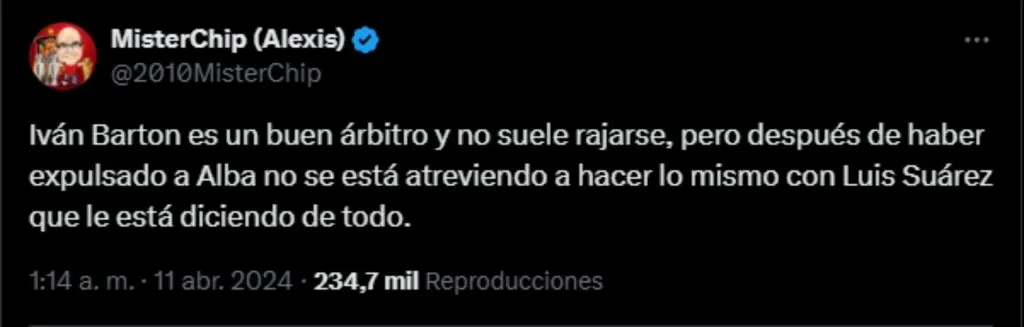 MisterChip publicó en sus redes sobre el trabajo del salvadoreño: “Iván Barton es un buen árbitro y no suele rajarse, pero después de haber expulsado a Alba no se está atreviendo a hacer lo mismo con Luis Suárez que le está diciendo de todo“.
