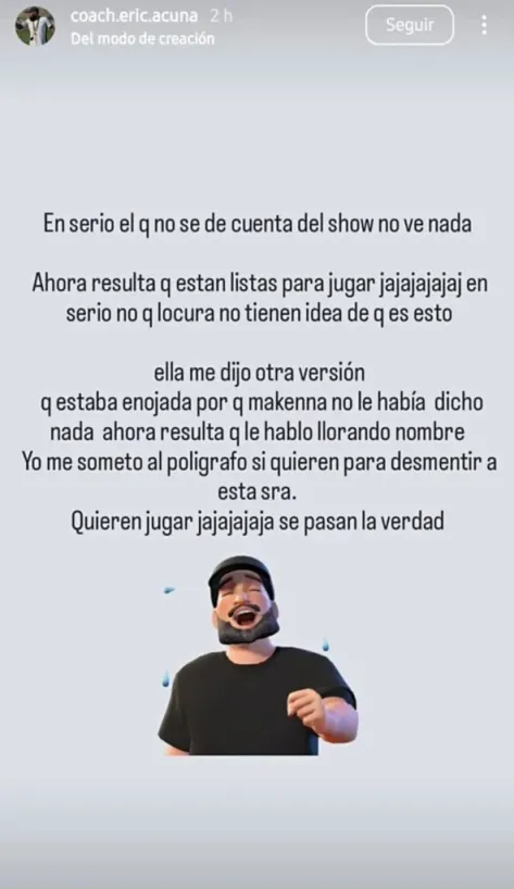 Por su parte Eric Acuña rompió el silencio y fiel a su estilo respondió con una historia en su cuenta de Instagram, en la que indicó que la mamá de la jugadora dio una versión diferente a lo que pasó e incluso afirmó que está dispuesto a pasar por el polígrafo para desmentir lo que declaró.