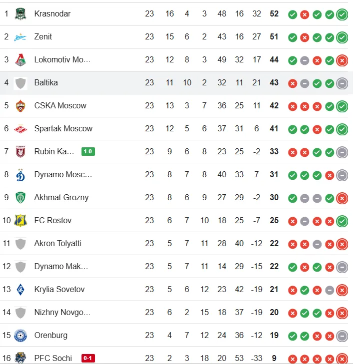 El Baltika mantiene sus posibilidades de campeonar. Actualmente, su equipo ocupa la cuarta posición y se encuentra a nueve puntos del líder Krasnodar. Suena difícil debido a que le sacan tres partidos de ventaja con siete por jugarse. No obstante, existen chances matemáticas.