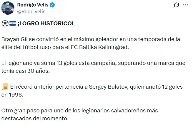 Brayan Gil llegó a los 13 goles en una misma temporada y, según la información del periodista Rodrigo Velis, superó los 12 que había hecho el ruso Sergey Bulatov en 1996 en la máxima categoría de Rusia. De esta manera, se convirtió en el máximo anotador en una sola campaña con el Baltika. “Otro gran paso para uno de los legionarios más destacados del momento“, comentó el periodista.