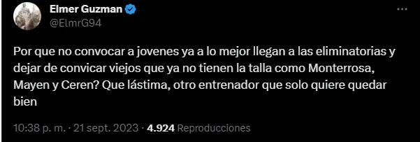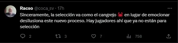 La mayoría de los comentarios, mostraron su enojo por la falta de renovación. “¿Por qué no convocar a jóvenes? ya a lo mejor llegan a las eliminatorias y dejar de llamar viejos que ya no tienen la talla como ¿Monterroza, Mayén y Cerén? que lástima, otro entrenador que solo quiere quedar bien“, comentó @ElmrG94.
