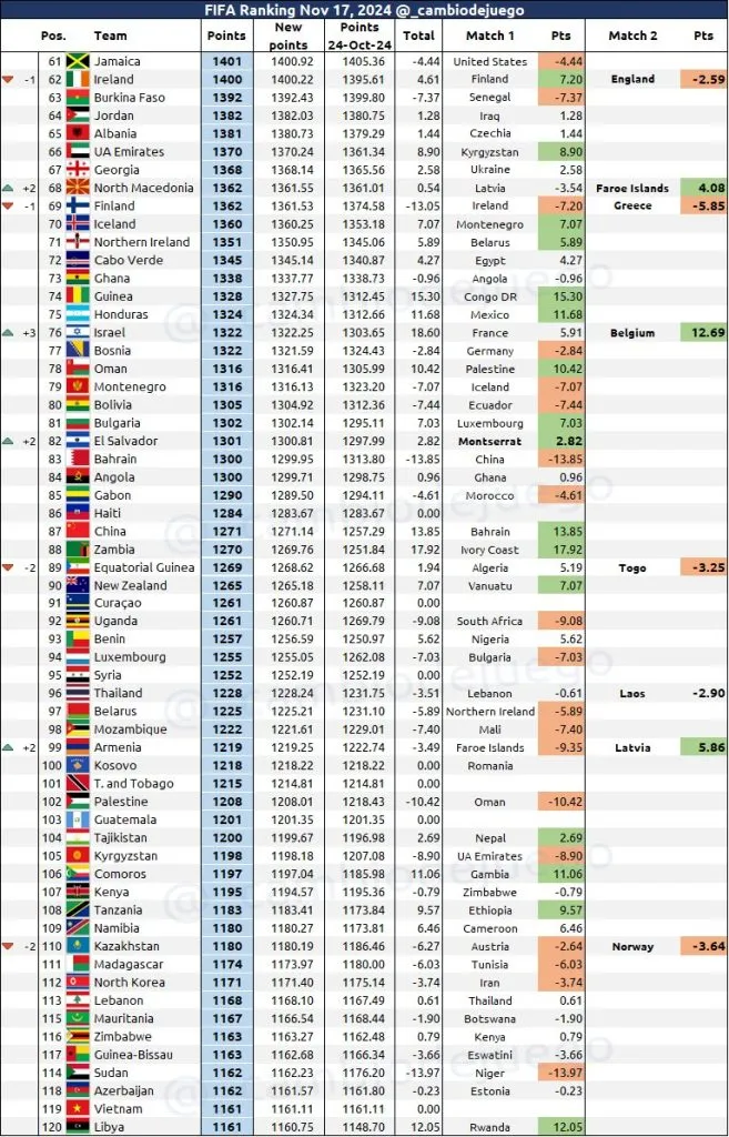 El Salvador se ubicará en el puesto número 82 con un total de 1301 puntos, consolidando su posición como una de las selecciones mejor clasificadas de la región. Por otro lado, Guatemala descenderá hasta el lugar 103, acumulando 1201 puntos, lo que refleja las dificultades que enfrenta en su camino hacia un mejor desempeño internacional.