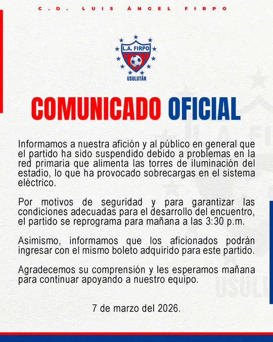 El encuentro, correspondiente a la Primera División de El Salvador, se disputaba en el Estadio Sergio Torres Rivera, en Usulután, cuando un segundo apagón en las torres de iluminación obligó a detener definitivamente el compromiso. La situación generó incertidumbre entre jugadores, cuerpo técnico y aficionados presentes en el recinto deportivo.