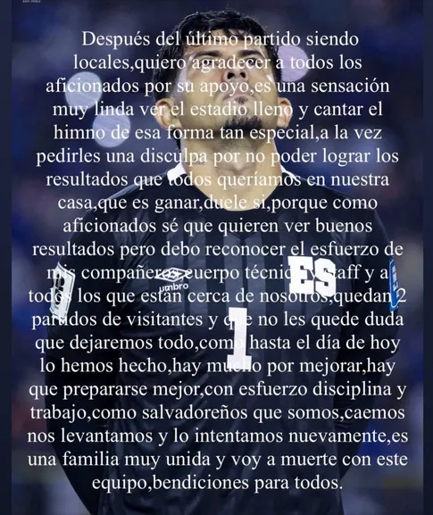 El arquero también aprovechó su mensaje para disculparse con los seguidores por no haber logrado los resultados esperados: “A la vez, pedirles una disculpa por no poder lograr los resultados que todos queríamos en nuestra casa, que es ganar. Duele, sí, porque como aficionados sé que quieren ver buenos resultados, pero debo reconocer el esfuerzo de mis compañeros, cuerpo técnico y todos los que están cerca de nosotros”.