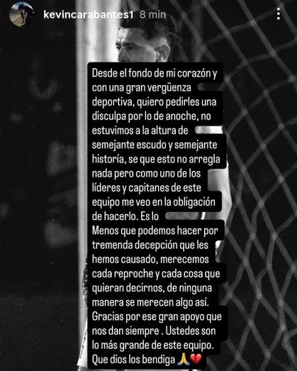 Carabantes habló de una profunda “con una gran vergüenza deportiva” y asumió buena parte de la culpa por no haber estado a la altura del compromiso. “No estuvimos a la altura de semejante escudo y semejante historia”, escribió, reconociendo que el nivel mostrado no correspondió a la grandeza del club. Además, señaló sentirse en la obligación de ofrecer disculpas como uno de los líderes del plantel, aunque aclaró que unas palabras no pueden reparar el golpe emocional causado a los aficionados.