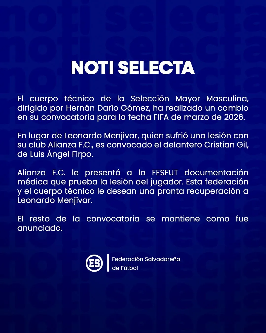 El que sale por una lesión es Leonardo Menjívar. El futbolista de Alianza tuvo una contractura en el muslo derecho en el partido contra Cacahuatique. Por este motivo, debió ser desafectado por el Bolillo Gómez para los próximos compromisos.