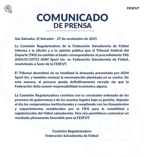 El Tribunal Arbitral del Deporte (TAS) resolvió a favor de la FESFUT, desestimando por completo la demanda presentada por AGM Sport Inc. y dejando el caso sin responsabilidad económica para la Federación Salvadoreña de Fútbol. La resolución fue anunciada este 27 de noviembre de 2025 por la Comisión Regularizadora, que calificó el fallo como “plenamente favorable”.
