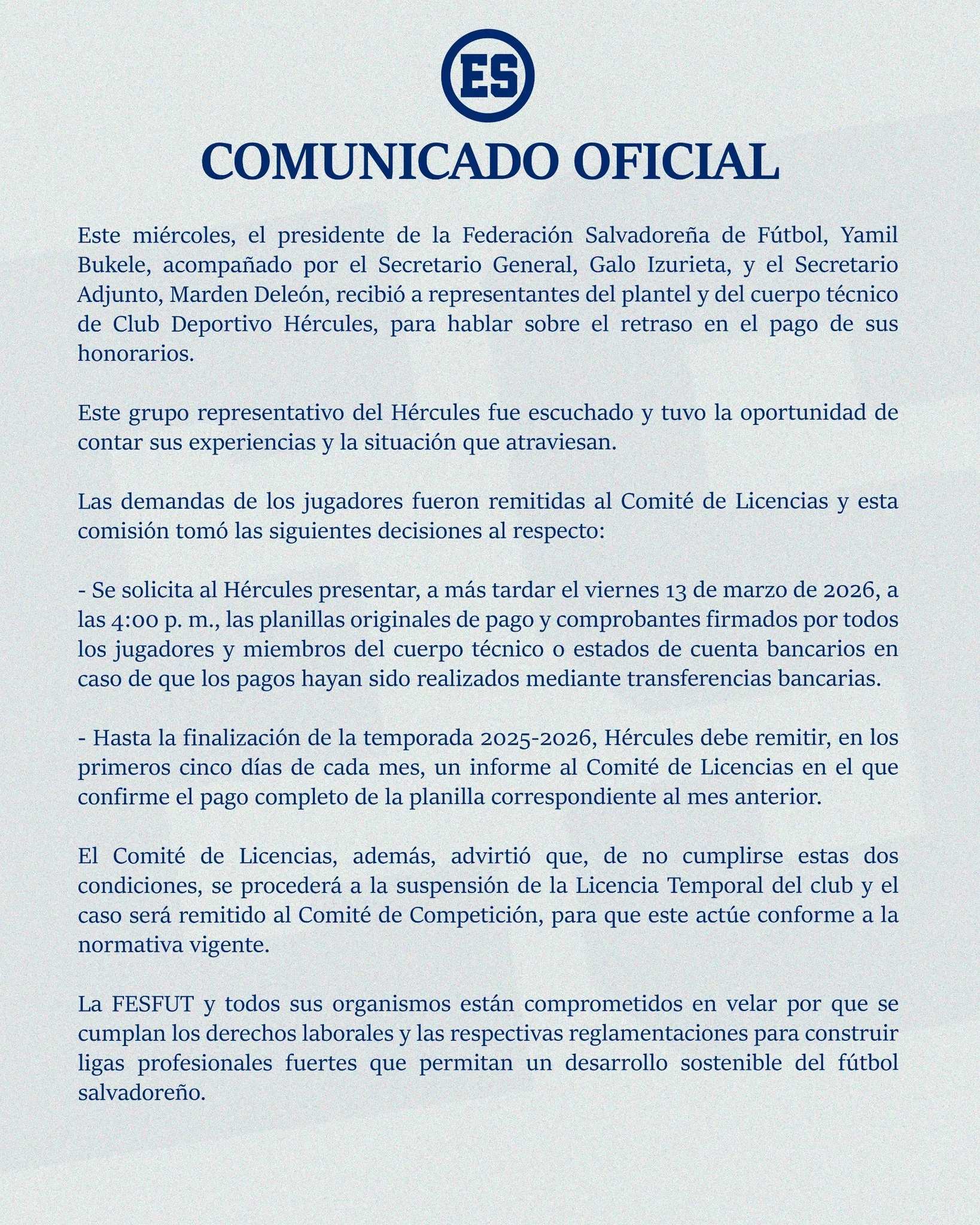 Entre las disposiciones establecidas, la Comisión de Licencias exigió que Hércules FC presente a más tardar este viernes a las 4:00 de la tarde las planillas originales de pago y comprobantes firmados por los jugadores y el cuerpo técnico, o bien los estados de cuenta bancarios en caso de que los salarios hayan sido cancelados mediante transferencias.