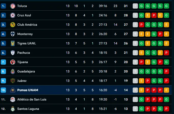 Pumas atraviesa un momento complicado en el torneo Apertura de la Liga MX, ubicándose en la décima posición de la tabla con 14 puntos tras 13 jornadas disputadas. El equipo universitario suma tres victorias, cinco empates y cinco derrotas, con un balance negativo de goles (16 a favor y 20 en contra).