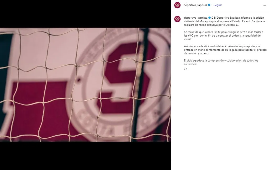 El Deportivo Saprissa informa a la afición visitante del Motagua que el ingreso al Estadio Ricardo Saprissa se realizará de forma exclusiva por el Acceso 11.