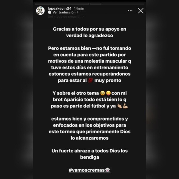 El que rompió el silencio fue López, que en busca de evitar cualquier polémica y ponerle punto final al tema, utilizó su cuenta oficial de Instagram para aclarar lo sucedido, además de también dar su versión por la que no fue convocado para el partido ante Malacateco de mañana, aduciendo que es por una lesión muscular.