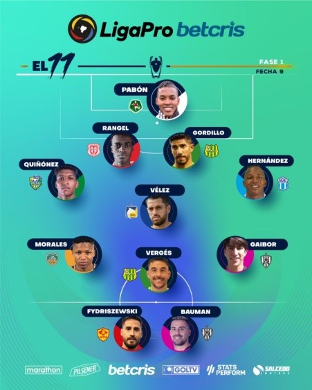 La Liga Pro dio a conocer este viernes el equipo ideal de la Jornada 9, donde destacó el nombre de Gordillo, quien nuevamente fue reconocido por su gran desempeño y en este caso por ser una de las figuras del equipo para que se lograra vencer al Barcelona SC, que es uno de los lideres de la tabla de posiciones.