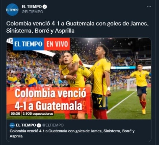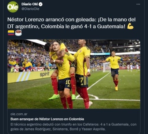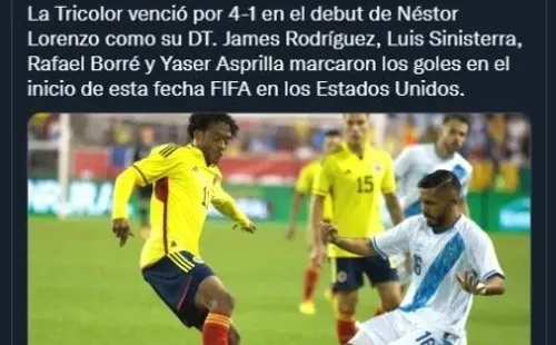 Colombia no tuvo piedad ante Guatemala en el amistoso por fecha FIFA y registró la primera goleada (4-1) en la era del estratega argentinoNéstor Lorenzo.Los responsables de las anotaciones fueron James Rodríguez (40′), Luis Sinisterra (57′), Rafael Borré (76′) y Yaser Asprilla (89′) para la Selección de Colombia. Mientras que para la Selección de Guatemala descontó sobre el finalÓscar Santiz (90′). Así reaccionóla prensa internacional tras este resultado de los sudamericanos ante los chapines.