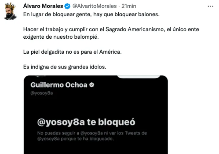 Sin embargo, el portero se cansó de sus detractores y tomó acciones al respecto en las redes sociales,siendo Álvaro Morales uno de los bloqueados por Ochoa en Twitter. A pesar d esta decisión, el periodista ´guatemaltecono se quedó de brazos cruzados y respondió de manera contundente en contra el arquero americanista.