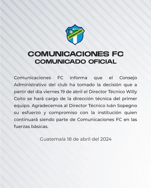 “El Consejo Administrativo de Comunicaciones FC ha tomado la decisión que a partir del viernes 19 de abril el director técnico Willy Olivera se hará cargo del primer equipo. Agradecemos a Iván Franco Sopegno su esfuerzo y compromiso con la institución, quién continuará siendo parte en las fuerzas básicas”, redactó el club.