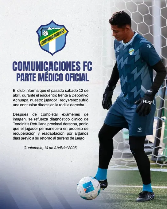 Este lunes, a través de un comunicado oficial, Comunicaciones confirmó con certeza qué le ocurrió al portero chapín. Según el parte médico, “Fredy Pérez sufrió una contusión directa en la rodilla derecha” en el partido del sábado. Luego de realizarse una serie de estudios, se determinó que tiene una tendinitis rotuliana en dicha zona.