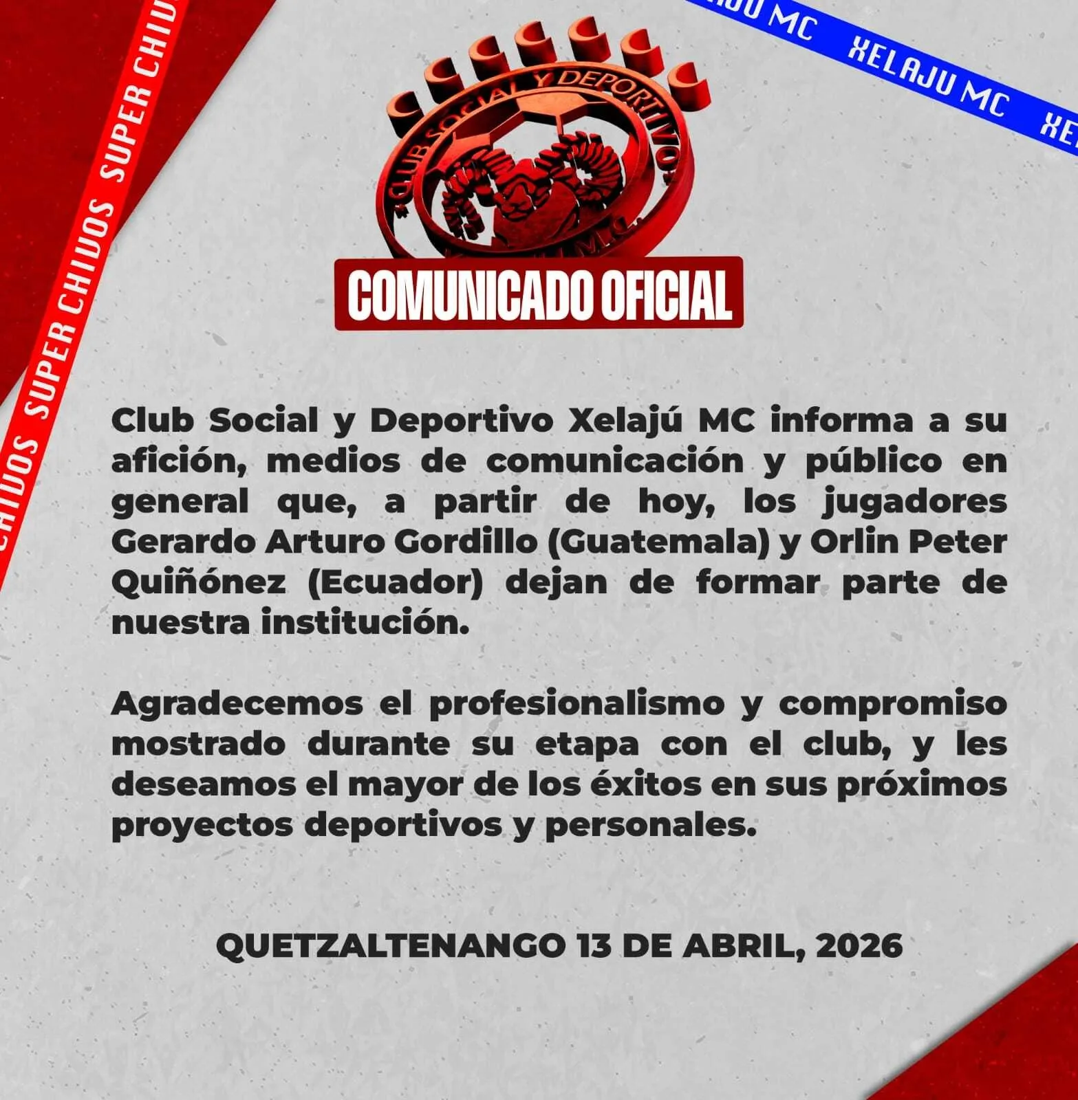 A través de un comunicado oficial, el Superchivo dijo: “Club Social y Deportivo Xelajú MC informa a su afición, medios de comunicación y público en general que, a partir de hoy, los jugadores Gerardo Arturo Gordillo (Guatemala) y Orlin Peter Quiñónez (Ecuador) dejan de formar parte de nuestra institución“.