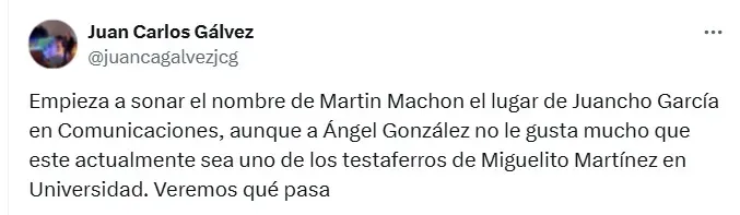 De acuerdo a la información del periodista Juan Carlos Gálvez, el dueño de los Cremas podría colocar como nuevo presidente a Martín Machón, exjugador de Comunicaciones y que se retiró con la camiseta crema en 2006. Durante su etapa como jugador, fue campeón de la Liga Nacional en dos ocasiones.