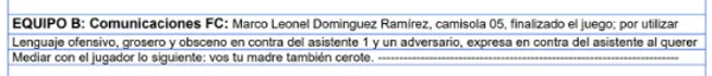 Según detalla el reporte arbitral, el experimentado futbolista fue expulsado tras insultar a un miembro de la cuarteta arbitral, utilizando una expresión considerada ofensiva, lo que derivó en la sanción disciplinaria impuesta por el árbitro central una vez concluido el encuentro.